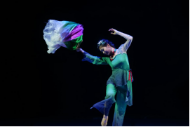 水声潺潺、鸟鸣幽幽,《桐言》中的三位少女手持彩扇,好奇张望,围绕长凳展开追逐游戏,诉说青春的种种趣事;舞蹈《天涯共此时》借助灯光,用丰富夸张的肢体语言与表情,表达了无限的哀愁与思念;《咏荷》中的舞者裙裾蹁跹,舞步欢快跳脱,展现了荷花从含苞到怒放的美好场景。