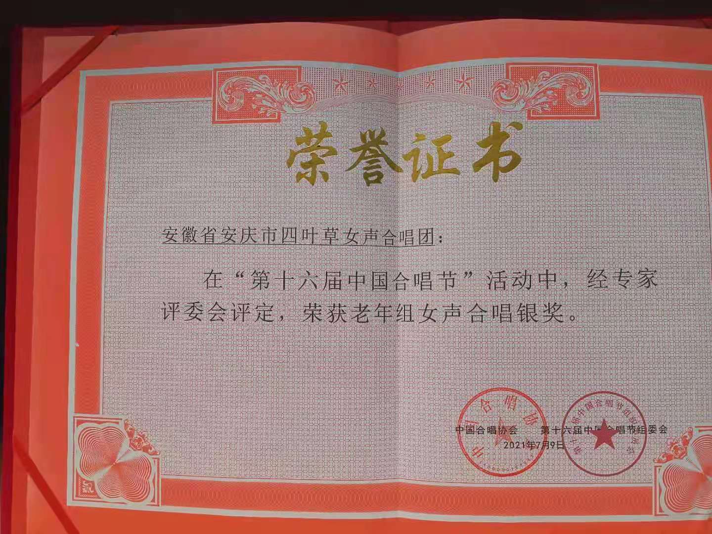 2021年7月5日至9日,以“颂歌献给党 启航新征程”为主题的第16届中国合唱节在湖北武汉市拉开序幕,来自全国20余省、市的82支合唱团,近5000人围绕比赛主题,高歌党的百年辉煌。tyc122ccVIP陈燕翔老师担任指导老师和合唱指挥的“安庆四叶草女声合唱团”在此次比赛中荣获老年组女声合唱银奖第一名。