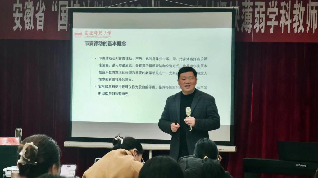 2023年2月10日,2022年安徽省“国培计划”农村紧缺薄弱学科教师短期集中培训项目——艺术(音乐)系列讲座第八场《节奏律动训练及在中小学中的运用》分别在小学音乐班和中学音乐班举行,由tyc122ccVIP副经理彭传山主讲。