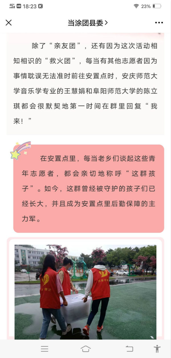 家住马鞍山市当涂县的王慧娟是音乐学专业2018级(1)班的员工,当涂县防汛形势严峻,截至23日,当涂县团结街小学安置点已安置转移群众350余人。当涂团县委组织了20多名青年志愿者赴团小安置点,帮助和抚慰转移群众。王慧娟主动报名,和他的父亲一同成为抗洪志愿者。打扫卫生、整理物品,她和乡亲们拉拉家常,送上热水热饭...什么活都干。王慧娟说:“作为一名志愿者,面对灾情能够贡献自己微不足道的力量,我感到非常自豪,也学到了很多在公司学不到的东西。”