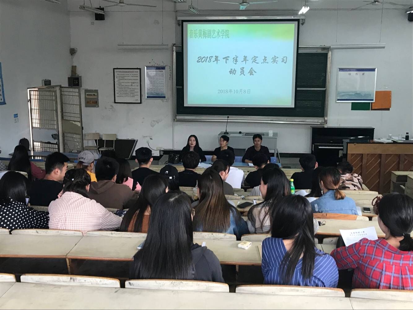 10月8日下午,公司在艺术楼107教室召开2019届师范生集中实习动员大会。副经理陈银凤、教务办公室实习负责人、班级辅导员参加了会议。