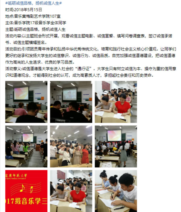 共青团tyc122ccVIP委员会音乐学专业2017级3班团支部成立于2017年9月,现有成员38人,其中,党员15人(含预备党员6人),占比39.4%,入党积极分子累计占比84.2%。四年来,支部在上级的坚强领导以及成员的共同努力下,力争创建优秀团支部,当好党的助手和后备军,荣获安庆市“五四红旗团支部”、校“红旗团支部”、“优秀团支部”、“十佳班集体”、“先进班集体”等荣誉。