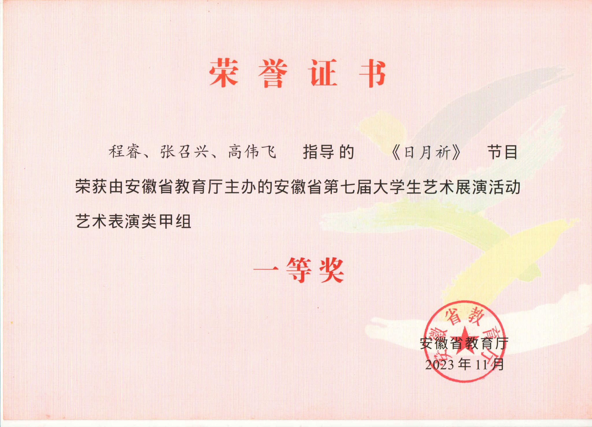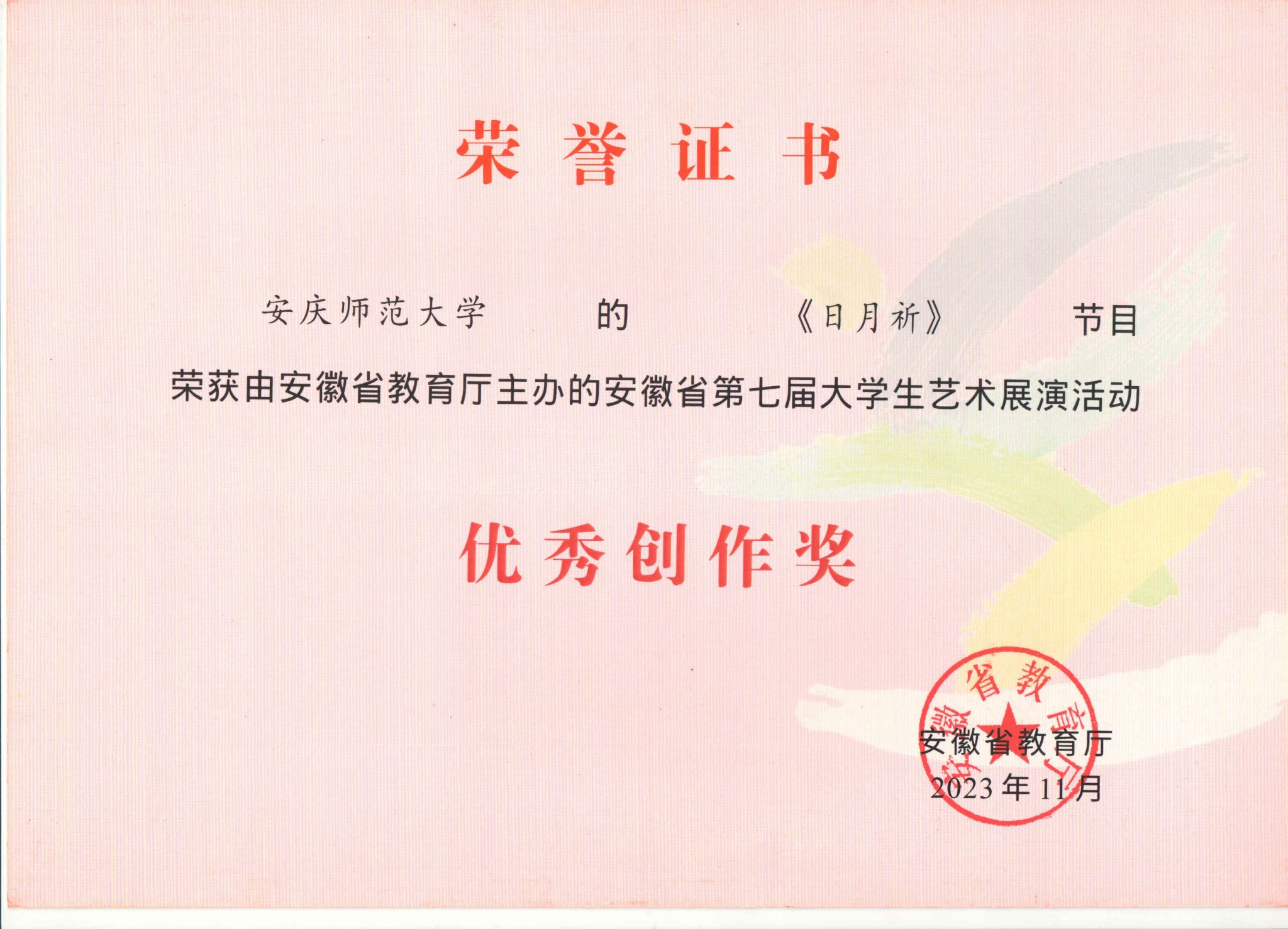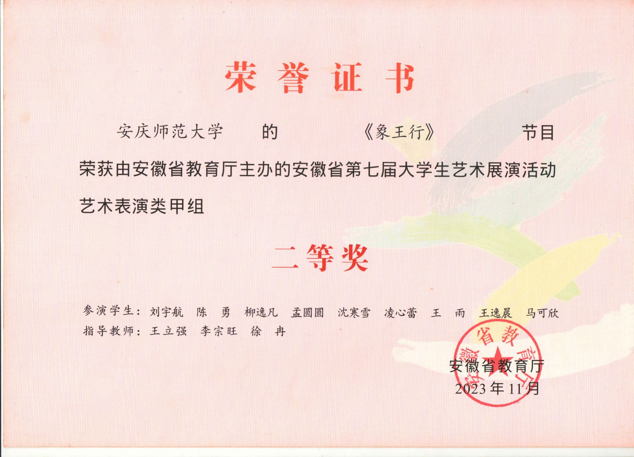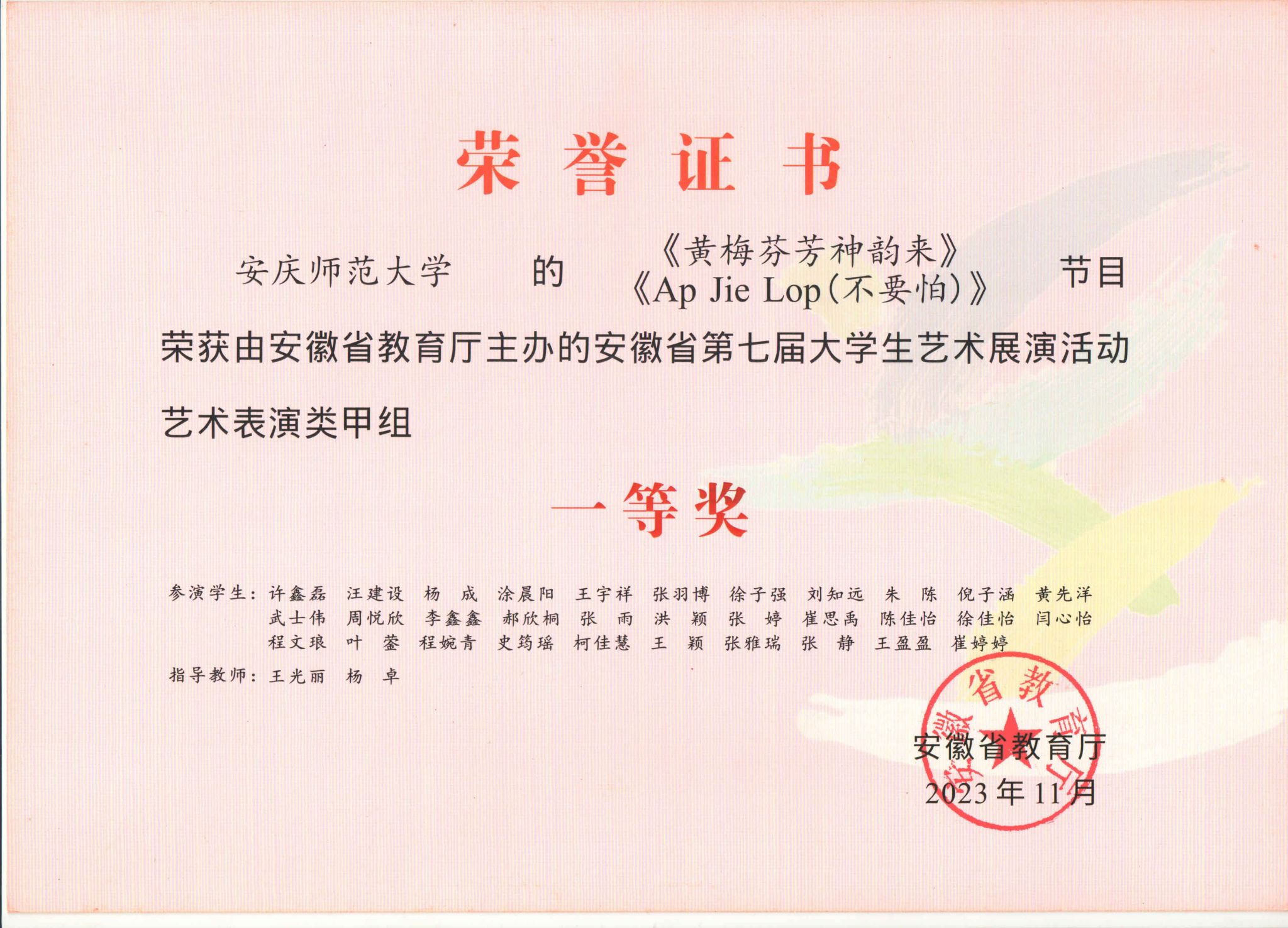 此次活动中,公司共有7件作品获得了省级奖项8项。程睿、张召兴、高伟飞指导的《日月祈》,获艺术表演类甲组一等奖和优秀创作奖;王光丽、杨卓指导的《黄梅芬芳神韵来》,获艺术表演类甲组一等奖;王立强、李宗旺、徐冉指导的《象王行》,获艺术表演类甲组二等奖;高艳、丁洁、张召兴、武警、程睿指导的《大江东去》《延乔路上》《柳京之舞》《苍歌引》,获艺术表演类乙组二等奖。