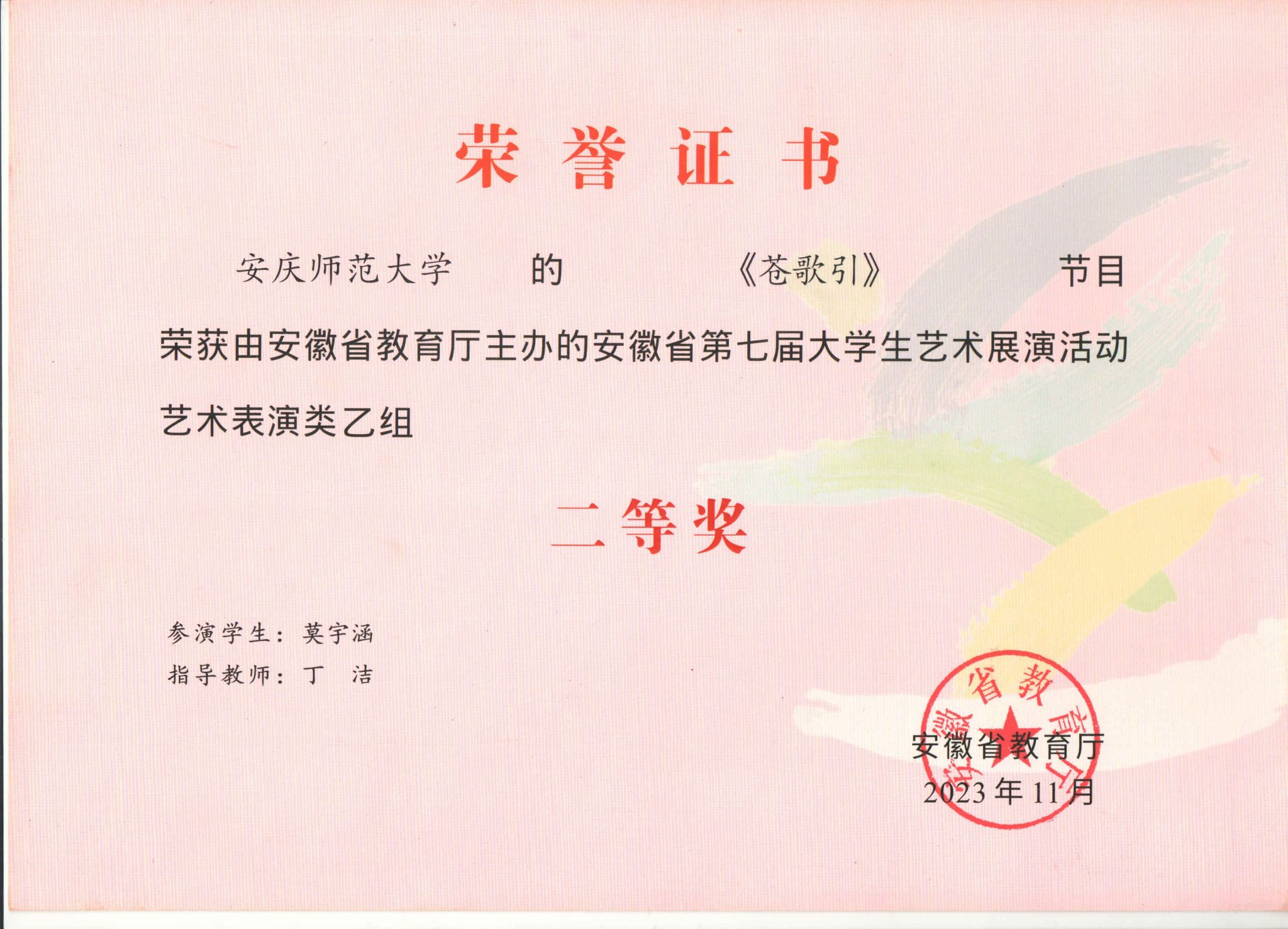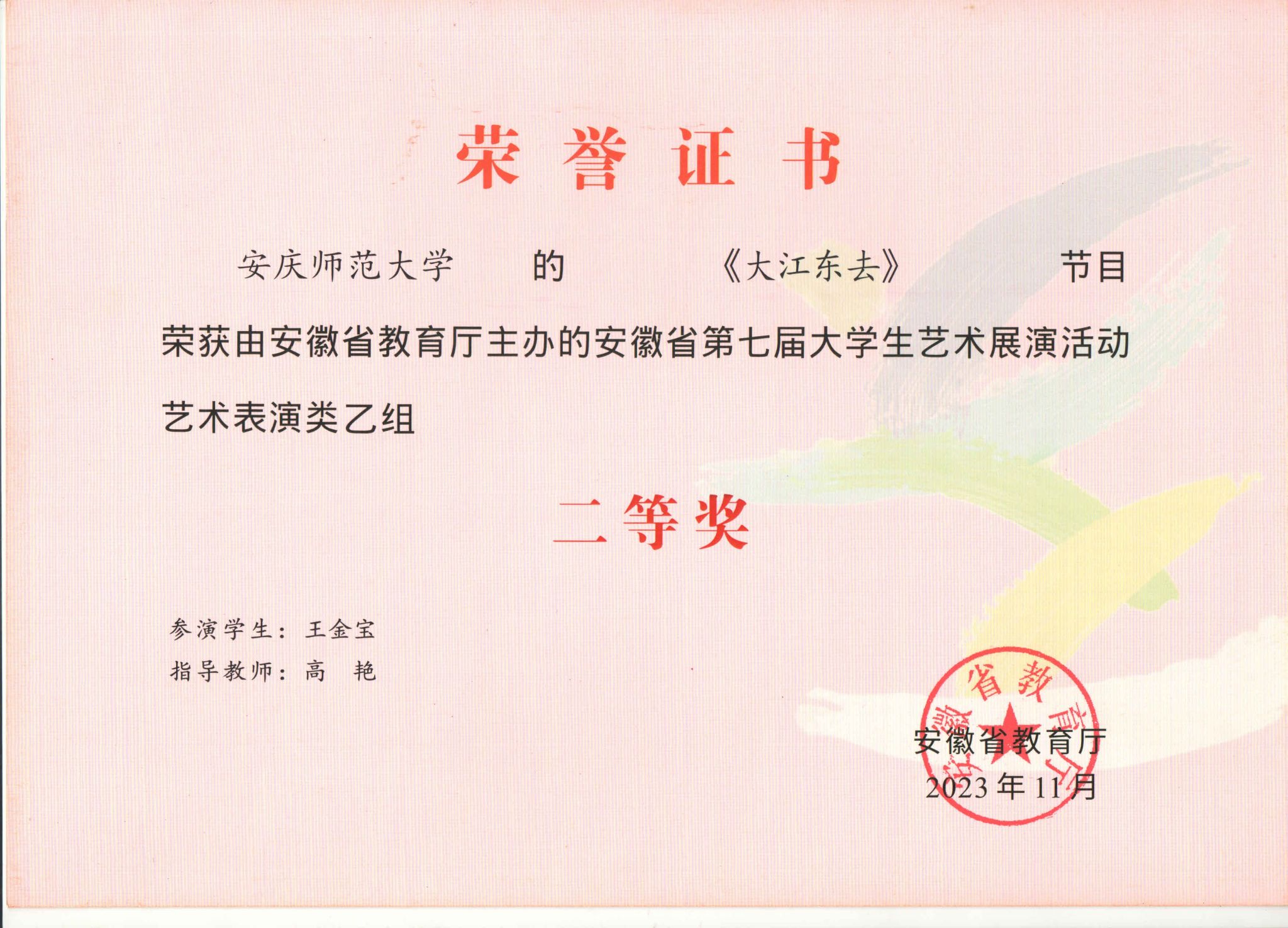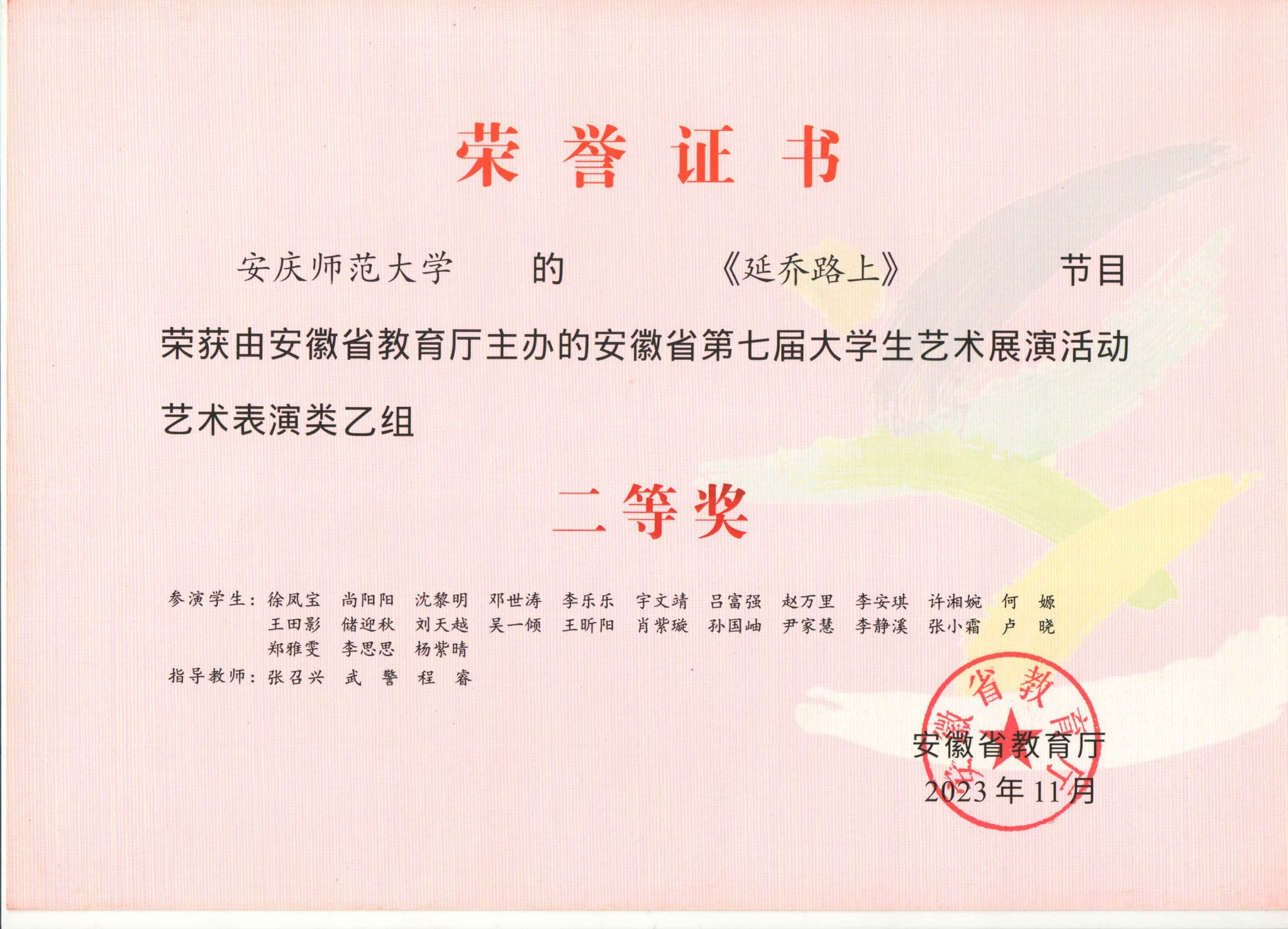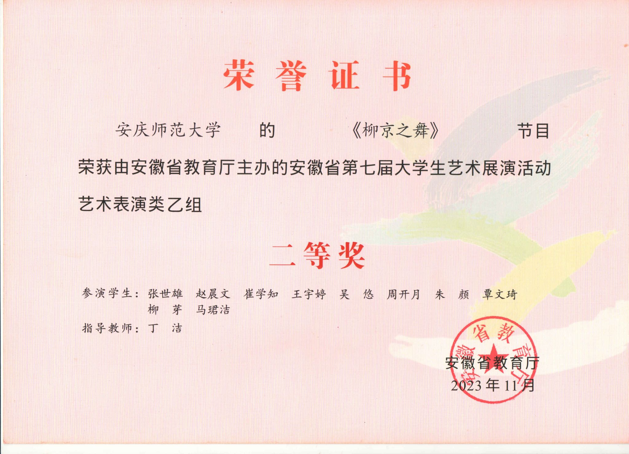 此次活动中,公司共有7件作品获得了省级奖项8项。程睿、张召兴、高伟飞指导的《日月祈》,获艺术表演类甲组一等奖和优秀创作奖;王光丽、杨卓指导的《黄梅芬芳神韵来》,获艺术表演类甲组一等奖;王立强、李宗旺、徐冉指导的《象王行》,获艺术表演类甲组二等奖;高艳、丁洁、张召兴、武警、程睿指导的《大江东去》《延乔路上》《柳京之舞》《苍歌引》,获艺术表演类乙组二等奖。