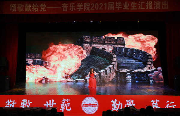 “我宣誓!我宣誓!我志愿加入中国共产党……”晚会以入党誓词歌《我宣誓》拉开序幕, 2021届音乐学专业毕业班全体党员共同演唱。毕业生党员们胸前佩戴党员徽章,身姿挺拔,用浑厚洪亮的歌声动情地传达对党的一片赤诚之心,赢得现场阵阵掌声。