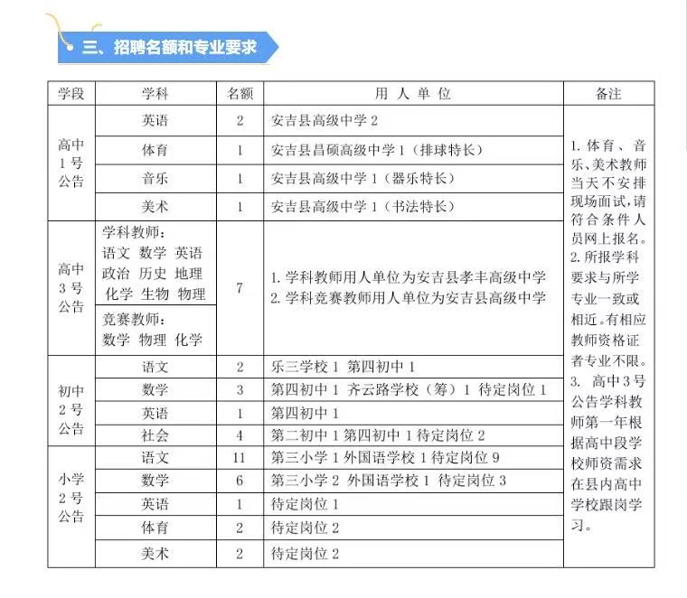根据《浙江省安吉县招聘2024年教师公告(第1号)》《浙江省安吉县招聘2024年教师公告(第2号)》《浙江省安吉县招聘2024年教师公告(第3号)》内容,我县组团赴安徽师范大学、湖州师范公司现场择优招聘事业编制教师44名,具体招聘事项公告如下: