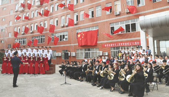 “起来,不愿做奴隶的人们,把我们的血肉筑成我们新的长城……”当雄壮的国歌声响起,全场肃立,齐声合唱。广场上由员工组成的大大的“70”字样,象征着新中国成立70周年。国歌奏毕,悠扬的《歌唱祖国》旋律缓缓响起,艺术楼二楼至五楼窗外40面国旗应声挥舞,迎风招展,蔚为壮观,合唱团团员们和现场师生挥舞着手中的国旗,一起歌唱美丽的祖国。